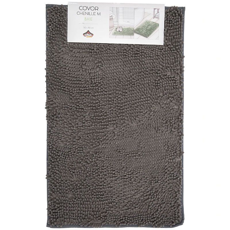 Covor baie Casa Plastor, Chenille, 50x80 cm M (grosime 2 cm), gri Covor de baie moale, confortabil si foarte placut la atingere gratie tesaturii de tip chenille; are o putere mare de absorbtie a apei, uscare rapida si o aderenta foarte buna pe suprafetele din baie. Instructiuni de utilizare: se spala la maxim 30 grade.