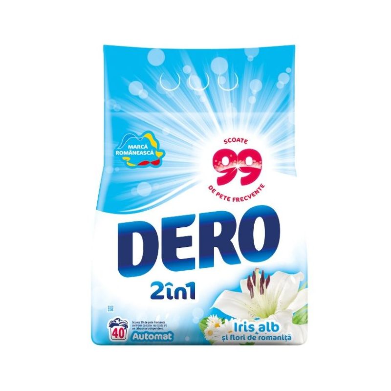Detergent automat Dero 2 in 1 Iris alb si flori de romanita, 4kg, 40 spalari