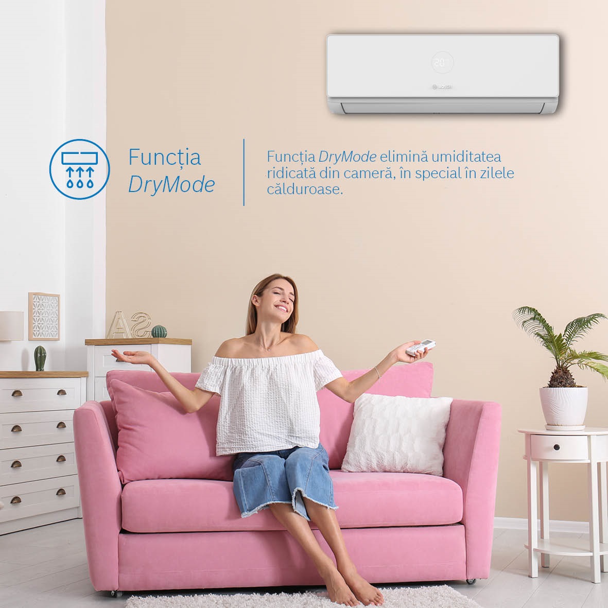 Funcția DEZUMIDIFICARE este benefică atunci când dorim eliminarea umidității în exces pentru creșterea confortului personal. Această setare adaptează umiditatea din aer la nivelul optim, fără a activa funcția de răcire, economisind astfel energia electrică.