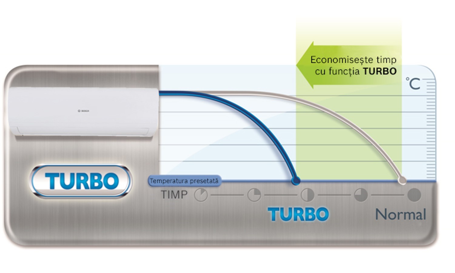 Modul TURBO, care poate fi accesat direct din telecomandă, este de mare ajutor pentru atingerea rapidă a unei temperaturi confortabile.