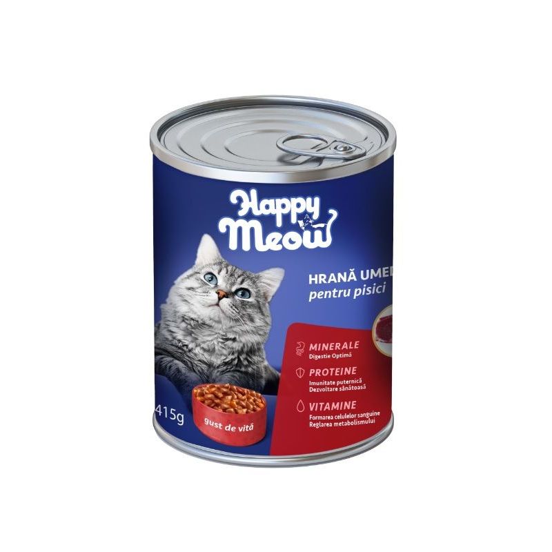 Conserva Happy Meow are multa carne de origine animala, asigurand aportul nutritional de calitate.
